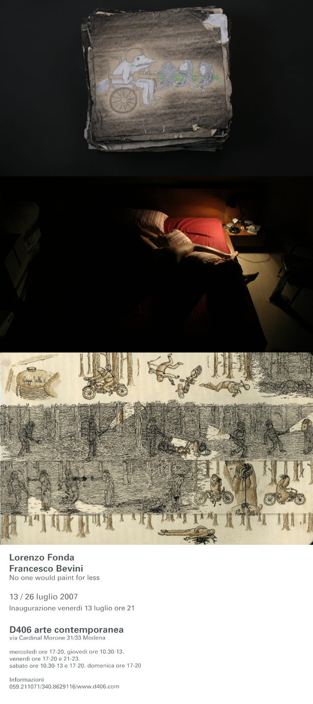 Con la mostra NO ONE WOULD PAINT FOR LESS di Lorenzo Fonda e Francesco Bevini in programma dal 13 al 26 luglio, si conclude l'attività espositiva della galleria D406 che riaprirà a settembre in occasione del Festival della Filosofia.